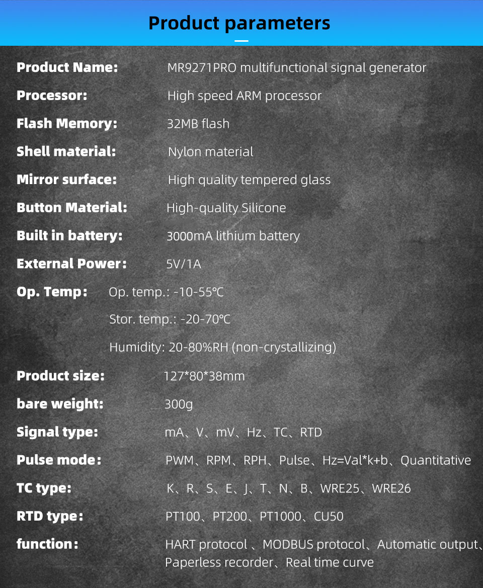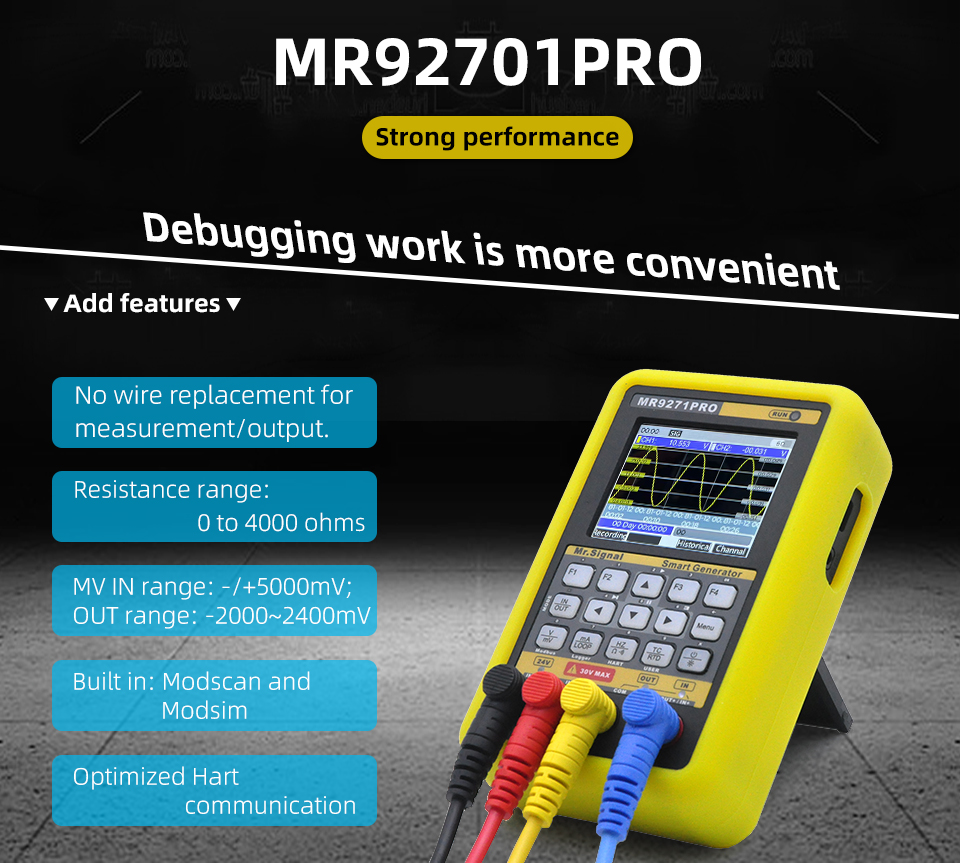 MR9271PRO is a Multi-function signal generator with HART and Modbus protocol.Precision enhancement signal simulation PT100\PT1000\TC.